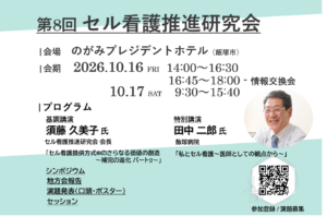 〈更新情報〉演題発表抄録を掲載いたしました 2025 10/04 セル看護推進研究会 「第7回セル看護推進研究会」演題発表プログラム更新および抄録を公開いたしました。 ☆参加申込はコチラから ※参加登録期間:2025年10月13日(月)迄 ⚠定員になり次第締切 演題発表抄録はこちらから 第7回セル看護推進研究会 参加者の皆様へ セル看護推進研究会 〈更新情報〉演題発表プログラム(10月19日)を公開いたしました 【セル看護提供方式®】研修を開始しました☺ 関連記事 《開催実績更新》第7回セル看護推進研究会<2025年10月18日・19日> 2025年11月27日 〈更新情報〉演題発表プログラム(10月19日)を公開いたしました 2025年9月12日 〈更新情報〉日程表およびポスターを公開いたしました 2025年8月13日 〈更新情報〉演題募集を締め切りました ※採択通知は9月上旬送付予定 2025年8月8日 〈更新情報〉演題募集期間延長『第7回セル看護推進研究会』※7月31日(木)迄 2025年7月9日 〈更新情報〉地方会報告決定/出展・協賛募集ご案内『第7回セル看護推進研究会』 2025年5月21日 お知らせ 【セル看護推進研究会 第1回関東地方会】開催決定 2025年5月20日 〈更新情報 〉特別講演『第7回セル看護推進研究会』 2025年4月3日